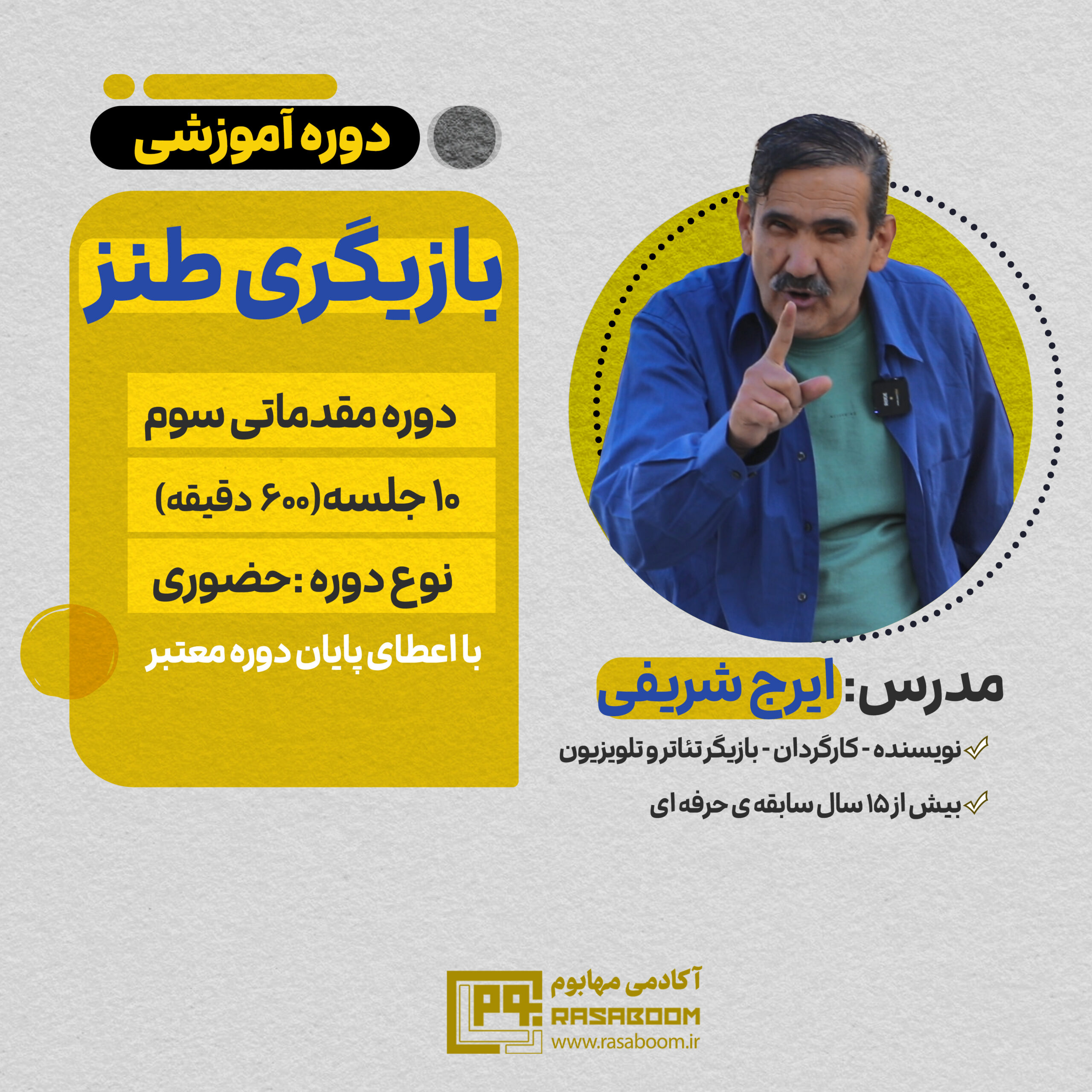 خانهمهابومهنر و خلاقیتایرج شریفیدوره آموزشی بازیگری طنز – مقدماتی سوم